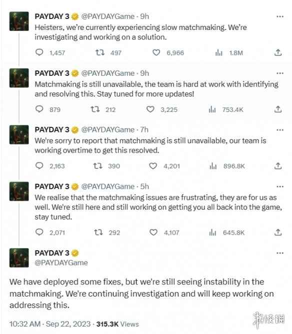 多人合作劫掠射击游戏《收获日3》已在北京时间2023年9月21日23点正式解锁,然而大量玩家反映游戏服务器太差无法匹配,甚至无法进入游戏,对此《收获日3》官方在推特上向玩家道歉,并表示已经部署了一些修复程序,但匹配仍然不稳定,他们会继续调查原因并在加班加点的努力解决。