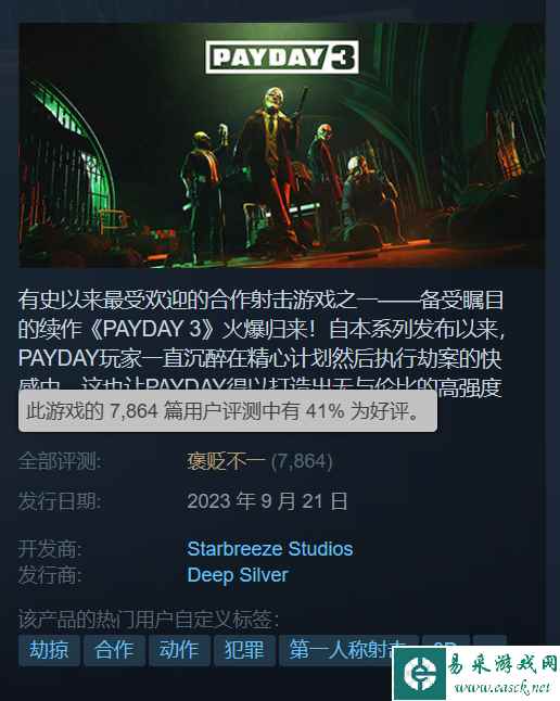 大量玩家因服务器问题在Steam上给《收获日3》差评,截止至本稿发出时评论人数已超7800,好评率仅有41%,好评率持续下跌中(上午为49%)。