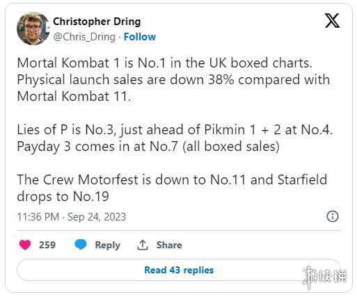 GamesIndustry的Christopher Dring在推特上与我们分享了最新一周的英国实体版游戏销量数据,根据销量排行榜数据显示,上周英国销量最好的实体版游戏是《真人快打1》,不过相比前作(2019年发售的《真人快打11》),它首发的实体版销量下降了38%。但我们也要清楚一点,那就是目前实体版游戏销量整体下滑是一个大趋势。