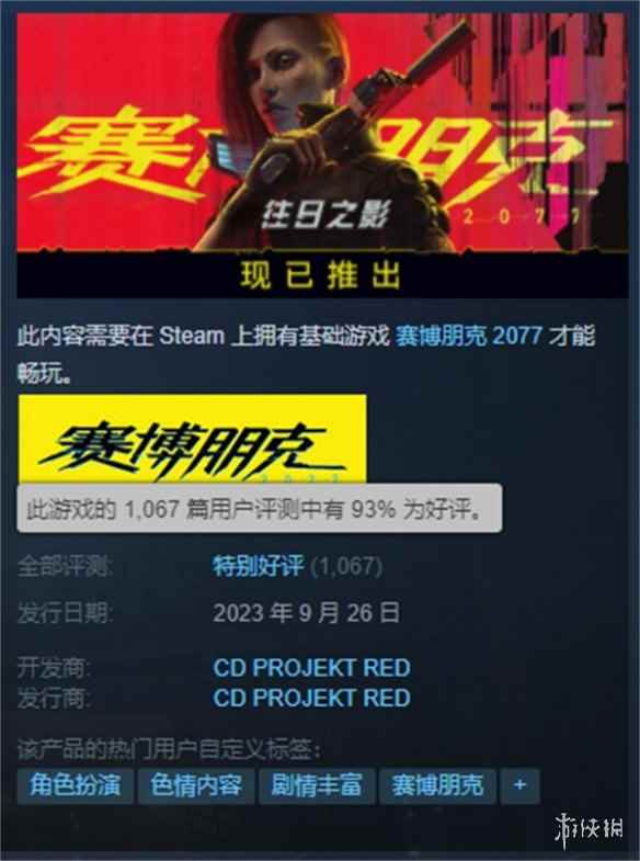 当前《赛博朋克2077:往日之影》售价149元。Steam评价为特别好评,在1067篇用户评价中有93%为好评。