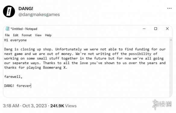 独立游戏开发商 DANG! 在10月3日宣布工作室倒闭,官方在公告中表示他们已经没钱了,无法为下一款游戏筹到资金,开发人员们已经分道扬镳了,他们很感谢玩家们能玩他们的《回力镖X(Boomerang X)》,但是时候说永别了。
