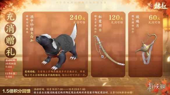 秋意起,重阳至。《剑网3缘起》重阳佳节充消好礼资讯今日首曝,萌趣功能跟宠「酒中仙·獾太白」、背部挂件「虹霞照日」、腰部挂件「琉璃月」为侠士们更添节日喜气。另有史诗级秘境“大明宫”25人英雄模式将于10月13日20:00开放,挑战首领还有双人坐骑「狼烽夜宴」、背部挂件「黑龙斩铁」等特殊掉落亟待侠士获取!诸多精彩内容,不可错过! 【好礼相随 重阳充消享佳品】 岁岁重阳,登高赏茱萸之时定少不了好礼陪伴。10月16日7:00至11月6日7:00期间,侠士充消60元可领精美腰部挂件「琉璃月」,充消120元可领取精美背部挂件「虹霞照日」,充消达240元更有萌趣功能跟宠「酒中仙·獾太白」可领取,侠士召唤此跟宠并开启商店后,所有侠士可点击修理装备并换购烟花,每20小时可开启一次。三档充消好礼,每一款都独具风采,是侠士们踏秋而行的最佳单品选择!