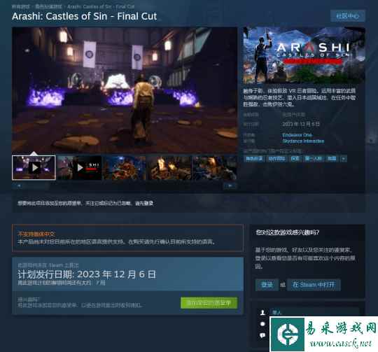 发行商 Skydance Interactive 和开发商 Endeavor One 将《岚:罪恶之城-最终版》的发行日期从原计划的 11 月 17 日推迟到 12 月 6 日。该游戏将通过 PlayStation Store 面向 PSVR2、通过 Steam 面向 PC 以及通过 Oculus 商店向 Quest 2 和 Quest 3 发售。 游戏的 Steam 商店页面已经上线,游戏暂未宣布支持简体中文。