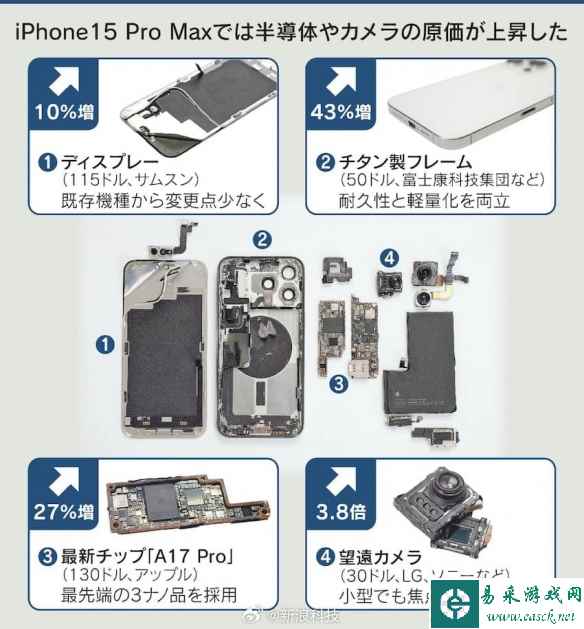 日经新闻在报道中列举了数据和拆机图示,iPhone 15 Pro Max物料成本558美元(约4080元人民币),零部件成本占比为47%,相比较iPhone 14 Pro Max高出12%。 这份拆解报告由日本Fomalhaut Techno Solutions得出,认为iPhone 15 Pro Max的屏幕成本比前代高出10%、钛金属边框成本高出43%,A17 Pro芯片的成本比A16 Bionic贵了27%;长焦相机及其四棱镜系统的价格也比其前代高出3.8 倍。