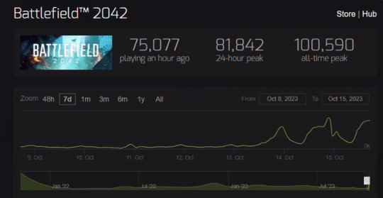 但在过去的这一年中,官方始终在维持着游戏的正常更新,《战地2042》的玩家数也渐渐稳定了下来。直到最近几天Steam开启了1.6折的优惠,《战地2042》迎来了一波新玩家,游戏的玩家在线人数突破8w人,直追刚发售时的10w人峰值。