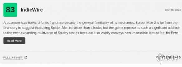 IndieWire 83分: 尽管《蜘蛛侠2》的游戏机制已广为人知,但它仍是该系列的一次巨大飞跃,成为不断扩展的蜘蛛侠故事多元宇宙的重要补充。