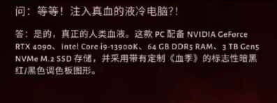 这台主机的配置不可谓不高,可最让人惊讶的还是它特别的冷却设备。按照官方的说法,这是一台真正注入人类血液的水冷散热设备。当玩家们达到预定的666夸脱的献血数时,暴雪将面向全体网友抽奖送出。(没有献血的玩家也有参与资格) 尽管《暗黑破坏神4》的这台主机采用“血冷”设备,乍一看很像是“假新闻”,但在活动中暴雪特别强调了“血冷”的真实性,这就让活动变得很不一般。