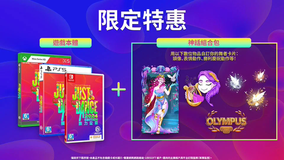 育碧跳舞游戏《舞力全开2024》今日正式发售,并提供免费体验版下载,体验版可以免费游玩《Tití Me Preguntó》和《After Party》两首曲目。本作共收录40首曲目,从最新金曲到受人喜爱的经典作品,包括 Miley Cyrus 的〈Flowers〉、Bad Bunny 的〈Tití Me Preguntó〉、BLACKPINK 的〈How You Like That〉以及 Whitney Houston 的〈I Wanna Dance With Somebody〉。 限定版额外附带神话组合包,包含以下数字内容: 女神凯西__头像 极乐世界之道__背景 奥运贝壳__边框 神灵旋律__表情动作 奥林帕斯__得分效果 神威胜利__胜利庆祝动作