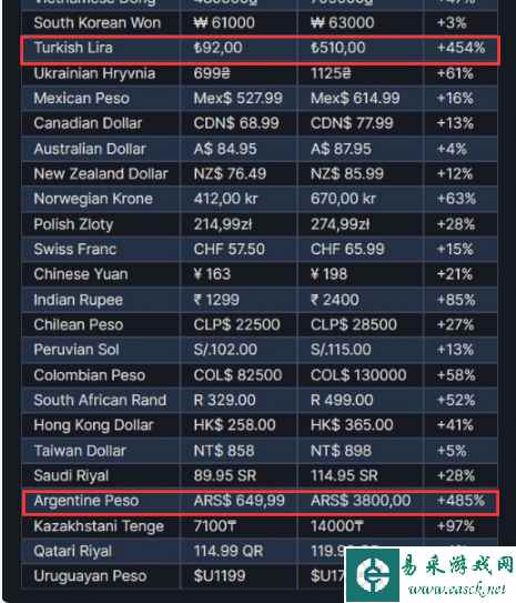 Steam最具代表性的低价区阿根廷区、土耳其区在过去的一年中,多次遭遇了游戏售价上调的情况。部分游戏的售价因为成倍增长,甚至比绝大部分地区的售价更高。去年10月份,在Steam更新“地区定价建议”后,这两大低价区的售价涨幅一度达到了450%。