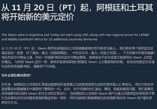 似乎是觉得光这样还不够,Steam在今日官宣了一则重要公告:从11月20起,Steam将把阿根廷和土耳其销售使用的货币改为美元。届时玩家Steam钱包中的所有余额都将按当天汇率兑换成美元。