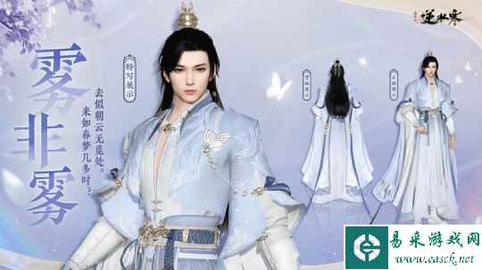 男款【雾非雾】则颇有文人雅士的温润气质,浅蓝外袍清冷优雅,花瓣状披肩搭配上胸前对称的蝴蝶银饰,腰间鎏金饰品,彰显着高贵的身份,妥妥就是言情小说中走出来的的温润公子。