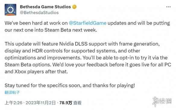 B社表示,他们一直在努力开发《星空》更新,下个新补丁将于下周推送到Steam Beta测试分支中,其中包含Nvidia DLSS(含帧生成)、显示和HDR控制选项、以及一些其它优化和改进。大家可以在Steam上选择“参加测试分支”来体验这些新内容并给官方提交反馈。在测试完毕后,新功能将在PC和Xbox上正式发布。