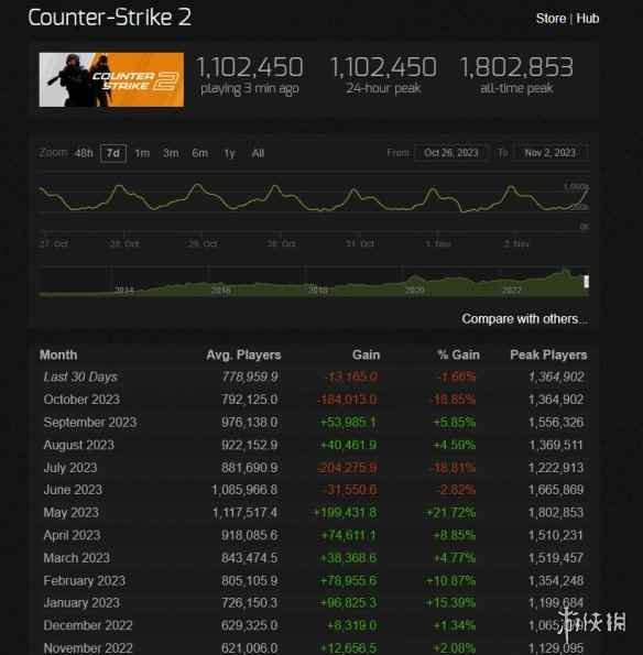 《CS2》10月减少了超过18万玩家:占玩家总数18.92%