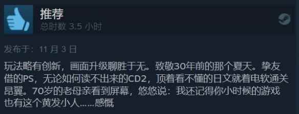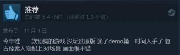 玩家评价方面,基本上都是好评,好评主要集中在:游戏情怀满满,治好了电子阳痿,游戏元素很丰富,复古像素人物配上3d场景,画面很不错。而差评主要是有玩家觉得这游戏的操作性太烂了。