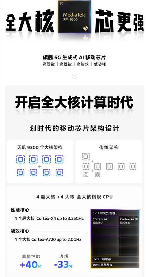 为了迎接现代和未来与日俱增的移动计算力需求,MediaTek跳出传统架构设计思维,开创性地设计了天玑9300的“全大核”CPU架构,包含 4个 Cortex-X4超大核,最高频率可达3.25GHz,以及4 个主频为 2.0GHz的Cortex-A720 大核,其峰值性能相较上一代提升40%,功耗节省33%。全大核架构工作速度快、效率高,具有高能效特性,无论在轻载还是重载应用场景中,都能降低功耗、延长续航时间。全大核架构的强劲多线程性能可以让终端的多任务处理更加流畅,例如同时进行游戏和视频直播,或是在进行游戏的同时播放视频。