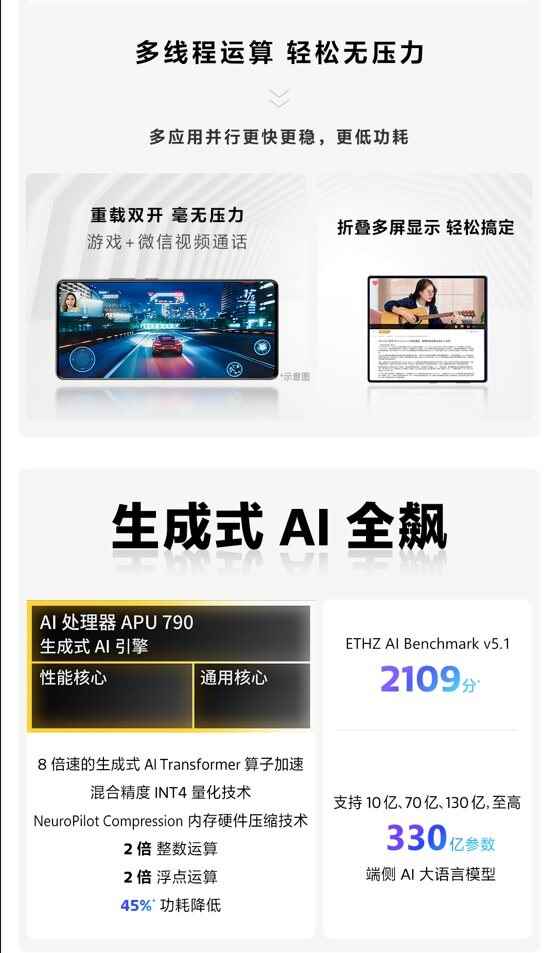 天玑9300集成MediaTek第七代AI处理器APU 790,为生成式AI而设计,其性能和能效得到显著提升,整数运算和浮点运算的性能是前一代的2倍,功耗降低了45%。APU 790内置了硬件级的生成式AI引擎,可实现更加高速且安全的边缘AI计算,深度适配Transformer模型进行算子加速,处理速度是上一代的8倍,1秒内可生成图片。基于亿级参数大语言模型特性,MediaTek开发了混合精度 INT4 量化技术,结合MediaTek特有的内存硬件压缩技术NeuroPilot Compression,可以更高效地利用内存带宽,大幅减少AI大模型对终端内存的占用,支持终端运行10亿、70亿、130亿、最高可达330亿参数的AI大语言模型。APU 790 还支持生成式AI模型端侧“技能扩充”技术NeuroPilot Fusion,可以基于基础大模型持续在端侧进行低秩自适应(LoRA,Low-Rank Adaptation)融合,进而赋予基础大模型更加全面的能力。MediaTek的AI开发平台NeuroPilot构建了丰富的AI生态,支持Android、Meta Llama 2、百度文心一言大模型、百川智能百川大模型等前沿主流AI大模型,完整的工具链助力开发者在端侧快速且高效地部署多模态生成式AI应用,为用户提供文字、图像、音乐等终端侧生成式AI创新体验。