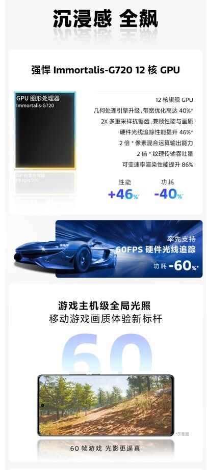 天玑9300率先采用新一代旗舰12核GPU Immortalis-G720,与上一代相比,峰值性能提升46%,相同性能下功耗节省40%,带来持久流畅的旗舰移动游戏体验。天玑9300搭载MediaTek第二代硬件光线追踪引擎,支持60FPS高流畅度的光线追踪,并带来游戏主机级的全局光照特效,为移动游戏画质体验树立新标杆。此外,MediaTek特有的MAGT游戏自适应调控技术升级为“星速引擎”,不仅与游戏应用广泛合作,还将拓展更多类型应用的生态合作,持续提升用户体验。