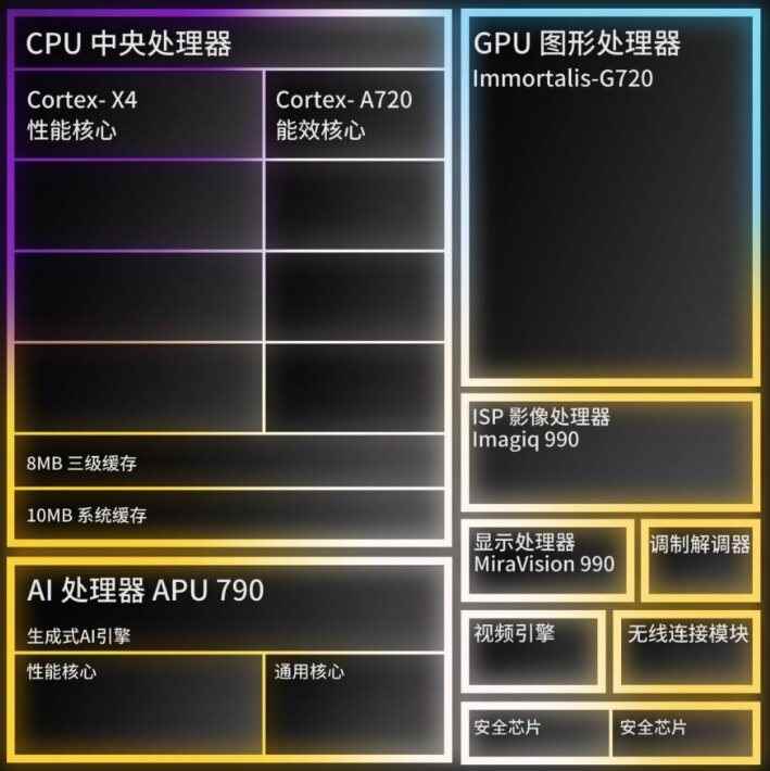 天玑 9300拥有旗舰级的ISP影像处理器Imagiq 990,支持AI语义分割视频引擎,可进行16层的图像语义分割,对捕捉到的画面色彩、纹理、噪点以及亮度进行实时逐帧优化,从而使得视频录制的画面更明亮、锐利且细节更丰富。借助景深和光斑双引擎的升级,天玑9300在4K视频录制时能呈现出电影级的光影效果。该芯片还集成了OIS光学防抖专核,可显著提升防抖运算速度和成片率,在运动场景和暗光环境下,能快速捕捉到高清晰度的图像。同时,天玑9300支持全像素对焦叠加2倍无损变焦功能。通过与全球领先的传感器厂商紧密合作,MediaTek将持续为用户打造专业的移动影像体验。 MediaTek天玑 9300的技术还包括: 移动显示:天玑9300集成了MediaTek MiraVision 990移动显示处理器,支持 180Hz WQHD 和120Hz 4K显示,以及折叠屏形态的终端设备双屏显示。它搭载了旗舰智能电视级的 AI 景深画质引擎,结合APU 790 的强大AI性能,可以实时侦测主要物体和背景图像,搭配MediaTek MiraVision PQ图像画质增强技术,可以动态调整主要物体的对比度、锐度和颜色,增强整体图像的立体感,让画面更加栩栩如生。另外,天玑9300 支持 Android 14 中的新Ultra HDR 格式,能让照片看起来更加鲜艳生动并与JPEG 格式兼容。 音频降噪:支持3个麦克风高动态录音降噪,凭借全方向的高动态收音能力,运用先进的噪声分离技术,可以有效过滤风噪等环境噪音,为用户提供更加纯净的HDR立体声录音体验。 无线连接:天玑 9300支持Wi-Fi 7,最高理论峰值速率可达6.5Gbps,同时搭载MediaTek特有的Wi-Fi 7增强技术,借助MediaTek Xtra Range™ 2.0 技术,Wi-Fi 7的室内覆盖可增加4.5米,并大幅提升设备间的数据传输速度,无惧干扰。天玑9300最高可支持3个蓝牙天线,特有双路蓝牙闪连技术,带来超低时延的蓝牙音频体验。 5G通信:集成5G调制解调器,支持 Sub-6GHz 四载波聚合(4CC-CA)和多制式双卡双通,搭载MediaTek 5G UltraSave 3.0+省电技术,大幅降低 5G 通信功耗。天玑9300将5G与AI融合,支持情境感知功能。 数据安全:天玑 9300集成双安全芯片,专用安全芯片采用了先进的用户数据安全设计,能够从开机源头开始保护个人隐私,同时具有物理隔离计算环境,让个人数据的加密和解密操作更加安全。MediaTek运用先进的内存标记扩展(MTE)技术打造更安全的应用程序开发环境,构筑更强大的用户数据安全保障。 制造工艺:天玑9300采用台积电第三代4nm制程。 内存支持:率先支持 LPDDR5T 9600Mbps 内存。