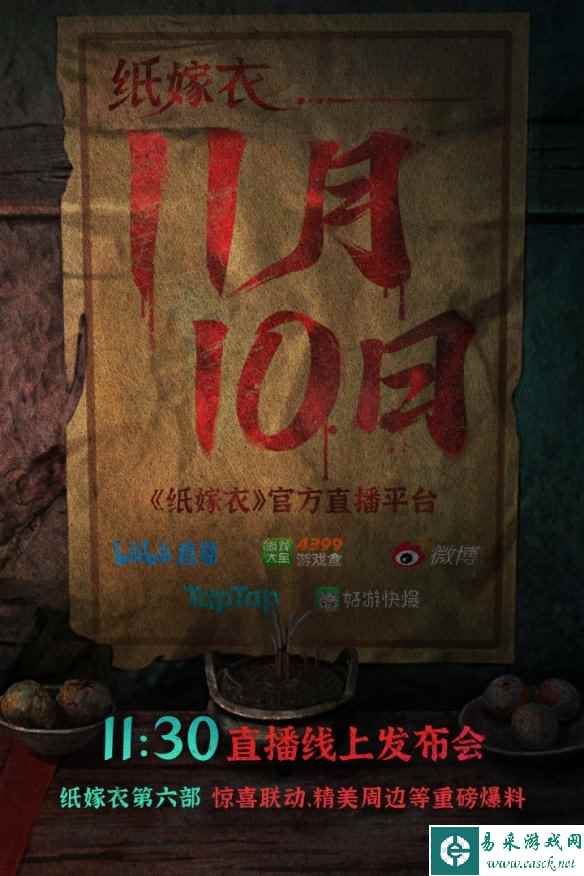 《纸嫁衣》官方今天(11月7日)宣布,《纸嫁衣6》的线上发布会将于11月10日11:30召开,除了新作的爆料,官方还将公开神秘联动、常驻周边,以及各种福利!