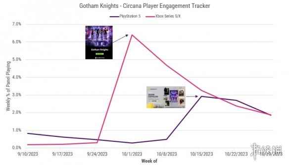 去年发售的《哥谭骑士》是一款比较平庸的超级英雄游戏,虽然游戏口碑不佳,不过毕竟是蝙蝠侠IP,所以还是能吸引一些玩家。今年这款游戏陆续进入了微软XGP和索尼PS+订阅服务,其热度果然迎来一大波上涨。 NPD数据分析师Mat Piscatella指出,《哥谭骑士》在今年10月进入了XGP订阅服务,没几周后又加入了PS+二/三档会员;在进入订阅服务后,这款游戏的热度果然迎来了上涨。 而且从图表中可以看出,XGP版《哥谭骑士》比PS+版更火,最火的时候有超过6%的Xbox玩家都玩了《哥谭骑士》,而PS+版最高是约3%的玩家在玩。这一方面可能是因为PS+版《哥谭骑士》只进了二/三档会员,入手门槛更高一些;另一方面PS主机本身的玩家总人数也比Xbox玩家更多。 此外,图表中显示,到了差不多10月底的时候,《哥谭骑士》在Xbox和PS主机上的热度已经有所下降,并且趋于同一水平。 |