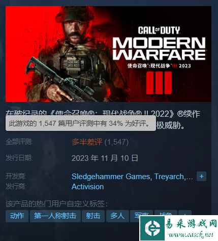 2.《使命召唤:现代战争3》Steam多半差评 《使命召唤:现代战争3》现已正式发售,截止至本稿发出时在Steam为多半差评, 好评率仅有34%。大多差评都与过于敷衍的单人战役有关。