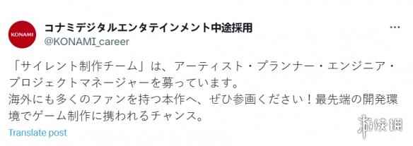 3.Konami 组建内部“寂静岭开发团队” Konami 官方发布了招聘信息,表示他们组建的内部“寂静岭开发团队”正在招人。Konami声称入职者拥有在最尖端的开发环境中参与游戏制作的机会。