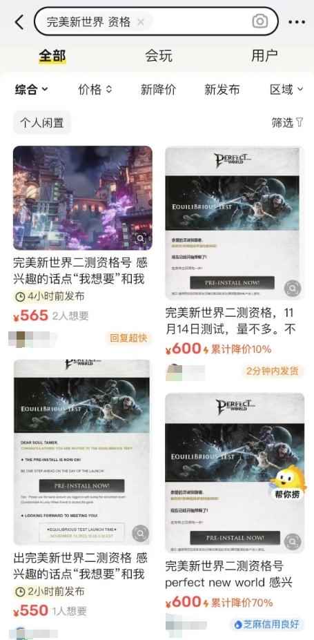 这也跟《完美新世界》并未在国内测试、宣发声量并不高有关系,毕竟当初《诛仙世界》的资格是炒到了四千元一个。