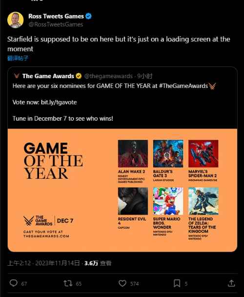 但玩家们的眼睛是雪亮的,这条推特下面基本都是对XboxNews观点的反驳。有的网友甚至拿《星空》游戏中需要不断读条的特性来整活,调侃TGA游戏展并不是没有提名《星空》,而是它正在加载。