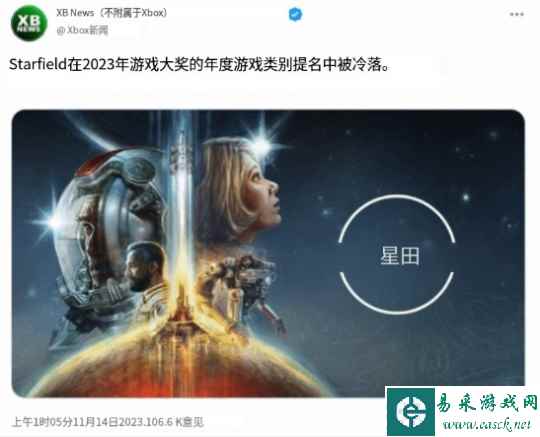 《星空》作为B社自《辐射76》以后推出的首款大型游戏,同时也是B社被XBOX收购后推出的首款3A大作。玩家们对于这款游戏,原本抱有很高的期许,但在发布后由于《星空》的实际质量并未达到预期,所以外界给予它的评价并不高。 此番没能获得TGA的提名,也有人为其鸣不平。外网专门发布XBOX新闻的博主XboxNews,就在推特上发文称:“《星空》在TGA年度游戏提名中被冷落了。”