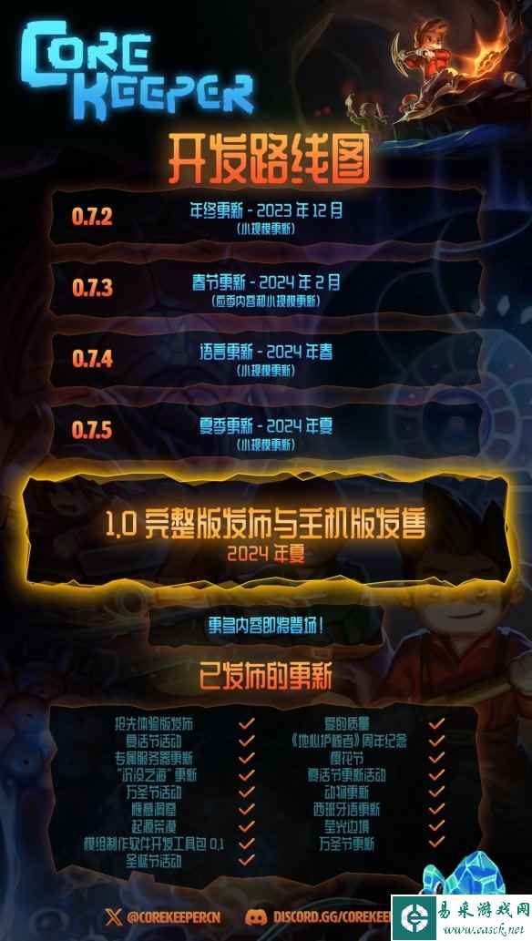 《地心护核者》是一款2D像素沙盒冒险游戏,自去年3月开始在Steam上“抢先体验”,目前玩家好评率91%。现在官方宣布将于明年夏季发布正式版本,届时还会登陆三大主机平台。此外,该游戏目前的总下载量已经突破200万。 游戏制作组表示,从抢先体验版发布至今,他们走过了一段令人难以置信的精彩旅程。现在展望明年将要在主机和PC平台上推出的1.0版本,他们感到正站在一个更加伟大的历史交点上。整个团队都充满了热情,已经迫不及待地想要让大家看看接下来都会迎来哪些内容了。 而官方现在也放出了一张后续更新计划路线图,其中显示今年12月还会有一次小规模更新,而在明年正式版上线前也会有数次更新,加入更多精彩内容。 《地心护核者》是一款支持1~8人游玩的沙盒游戏,在充满生物、资源和饰品的古代洞窟里挖掘遗物和资源,建造据点,打造新的装备,努力生存下去,探索各种生机勃勃的生态区,迎战洞窟生物,直面地底的庞然大物,击败它们,拿取战利品,以此来解开核心的奥秘。 |