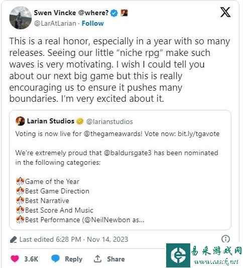 一时之间,《博德之门3》成为了业界同行们的学习对象,拉瑞安工作室的首席执行官Swen Vincke,期间也在社交媒体上高强度作业,分享着自己的心得。而在游戏获得八项TGA游戏奖项提名后,Swen Vincke更是对未来新作的开发进行了预告: “这是一个真正的荣誉,特别是在今年有这么多大作发行的情况下。看到我们的小众CRPG游戏掀起这样的波澜,大家都感到非常有动力。我希望我能告诉大家关于下一款重要游戏的消息,我们确保它突破了许多界限,我对此非常兴奋。”