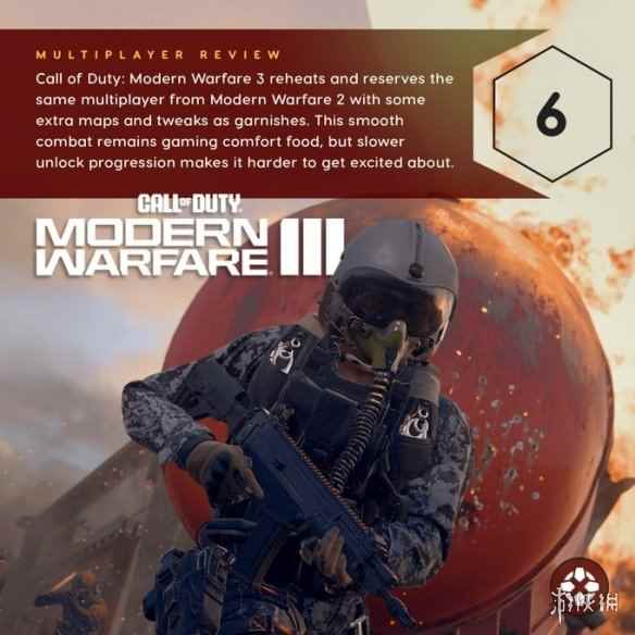 《使命召唤:现代战争3(Call of Duty: Modern Warfare III)》的多人模式收获了IGN 6分评价,IGN认为游戏延续并改进了前作《现代战争2》的多人模式,而且还融入了新的地图。游戏流畅的战斗也带来了安慰,但较慢的解锁进程难以令人兴奋。 IGN评分:6分(一般)