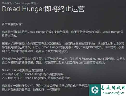 海上狼人杀《Dread Hunger》在近期宣布了有关于停服的消息。官方表示会在近期将游戏的购买渠道关闭,随后关闭服务器。 海上狼人杀《Dread Hunger》宣布停服海上狼人杀《Dread Hunger》的公告当中表示,游戏将于2024年1月1日停服。2023年12月1日游戏将停止购买,2024年1月1日游戏服务器将关闭。