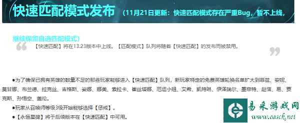 根据最新消息,英雄联盟在新版本更新当中在玩法方面作出了重大改动。为了更加契合玩家的游戏模式,英雄联盟的匹配模式即将下架,取而代之的是名为“快速匹配”的机制。 《英雄联盟》匹配模式下架,快速匹配登场【相关信息】 官方确认快速匹配机制将在不久后上线。
