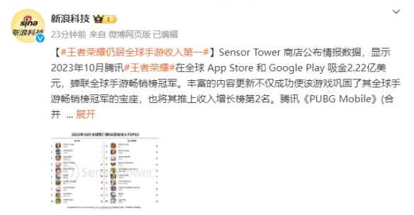 6.《王者荣耀》蝉联全球手游收入第一!吸金2亿美元 根据Sensor Tower商店公布的情报数据,今年10月《王者荣耀》在全球App Store和Google Play吸金2.22亿美元,蝉联全球手游畅销榜冠军。 《王者荣耀》不仅蝉联全球手游畅销榜冠军,还登上了收入增长榜第2名。腾讯《PUBG Mobile》(合并《和平精英》收入)以1.37亿美元的收入位列榜单第2名,其中,57.7%的收入来自中国iOS市场。