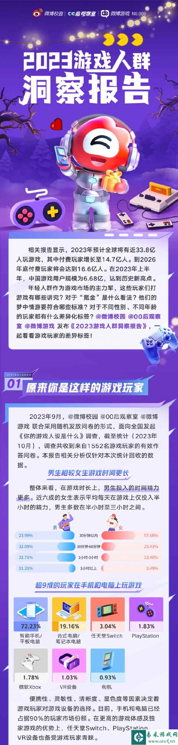 各位网友晚上好,来 晚报 看看今天有哪些值得关注的游戏资讯吧~ 1.新浪发布2023年游戏人群报告:打游戏多为缓解压力 新浪校园 联合 00后观察室 发布了2023年游戏人群洞察报告,根据报告显示,2023年预计全球将有近33.8亿人玩游戏,其中付费玩家增长至14.7亿人。到2026年底付费玩家将会达到16.6亿人。在2023年上半年,中国游戏用户规模为6.68亿,达到历史新高点。 截至统计(2023年10月),调查共收到来自1552名游戏玩家的有效作答问卷。本报告相关分析仅针对本次统计回收的数据。超60%的玩家表示玩游戏是为了打发时间和缓解压力,超60%的游戏玩家愿意为了游戏皮肤、道具及周边付费。 所有数据查看>>