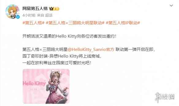 官方原文: 开朗活泼又温柔的Hello Kitty向各位访客发出邀约! 第五人格×三丽鸥大明星HelloKitty Sanrio官方 联动第一弹开启在即,园丁奇珍时装-异想Hello Kitty将上线商城,一起在欧利蒂丝庄园度过可爱时光吧!