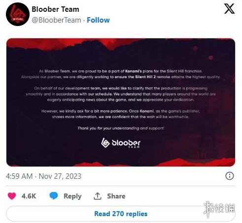 《寂静岭2重制版》发公告澄清游戏开发顺利。 这个公告挺让人不解的,制作游戏有必要特意发这种公告吗?是考虑到Twitter太多人问,还是《寂静岭飞升》口碑崩坏打算稳定军心?