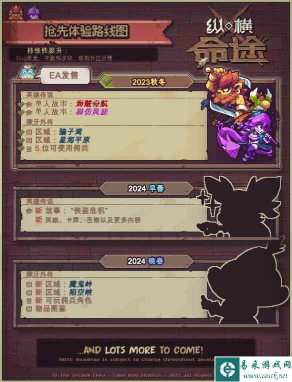在发售之际,官方也放出了未来一段时间的更新路线图,可以看到明年春天《纵横命途》将迎来两波重要更新,包括新的英雄、佣兵、可探索区域、卡牌及圣物等等。