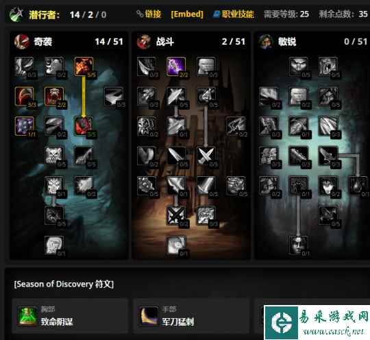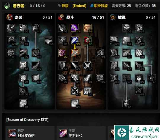 大家最期待的肯定是新玩法盗贼T,战斗系有很多提高生存能力的浅层天赋,不会像术士T点天赋那么难受。和其他非主流坦克一样,胸部符文送了免伤免暴和嘲讽,但没有血量和护甲加成。手部和腿部符文都是提高招架的,可以看出盗贼T的设计思路是类似TBC时期的高招架躲闪的高物理免伤坦克,但对于以法术伤害为主的敌人则没有太好的减免手段,而且几乎没有拉群怪的AOE能力,因此个人认为盗贼T难以成为主流坦克,可以辅修客串但不建议主修坦克玩法。 |