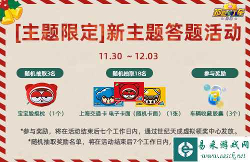 此外,为迎接新主题的即将来袭,繁荣山丘特别准备了新主题答题活动!在11月30日12月3日期间,参与答题并答对新主题相关的问题,即可获得“车辆收藏胶囊(3个)”。还有额外机会获得“宝宝脸抱枕”、“上海交通卡 电子卡面(随机卡面)”!答案可以在此前的未来版本内容前瞻会中找到,感兴趣的车手切勿错过哦! 点击前往观看未来版本前瞻会>>> https://www.bilibili.com/video/BV1su4y147gA/?spm_id_from=333.999.0.0&vd_source=b27ed4ef6ab8e79abcc67a097b58fc4b 点击前往参与新主题答题活动>>> http://evt.tiancity.yzz.cn/survey/survey.php?sname=POPKART20231130