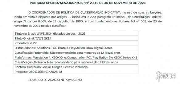 推主Andrew Marmo透露,《WWE 2K24》现已在巴西通过评级,但目前《WWE 2K24》尚未官宣。据评级页面显示《WWE 2K24》年龄分级为12+,内含暴力内容,将登陆PS4|5、XboxOne、XSX|S 和PC。