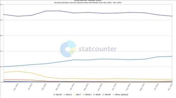 调查机构Statcounter的数据显示,Windows 11的全球市场份额继续提高,总占比达到了26.66%。目前,占比第一的依然Windows 10,份额达到了68%,相比较10月下降了1.31%,而Win 7和Win XP占比分别是3.16%和0.46%。微软已经明确表示,Windows 10 支持将于2025年10月14日结束,用户正好有两年时间升级硬件并安装Windows 11。