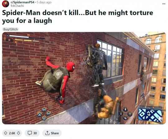 不过在游戏正式发售一个多月后,还有玩家发掘游戏中的BUG,从而达成了意想不到的笑料。 名为“fckChachi”的reddit用户,近日在论坛中的“漫威蜘蛛侠”板块中发帖,提到“蜘蛛侠绝对不会杀人……但他可能会为了整乐子而折磨人”。
