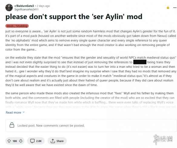 “Ser Aylin”MOD在上线时,便遭到一些同性恋人士的强烈抵制,Reddit上还有一篇贴子呼吁玩家不要支持该MOD,表示MOD作者歧视同性恋群体是有意为之,该贴已超过1.8万点赞。