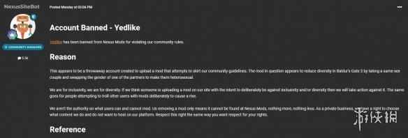 不过 N网 也在公告中做了“保命声明”如下: 我们支持包容性、支持多样性。如果我们认为有人在我们的网站上传故意反对包容性和多样性的MOD,那我们将采取行动,对于那些试图故意用MOD来欺骗他人来涨粉的账户也是如此。 我们并没有权利决定用户可以或不可以修改什么。删除一个MOD仅意味着它无法在Nexus Mods 上找到而已。作为一家私营企业,我们有权利选择在自家平台上展示和不展示哪些内容。请尊重这一权利,像您希望自己的权利得到尊重一样。