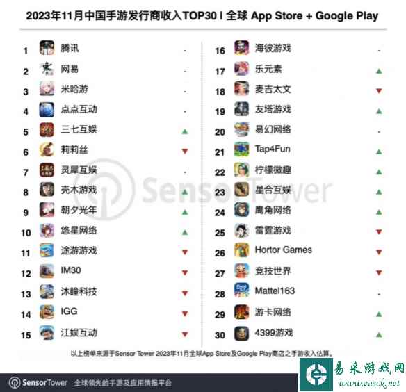 根据Sensor Tower公布的排名,腾讯、网易、米哈游依然位列中国手游发行商全球收入排行榜前三。 榜单之外,入围全球收入TOP100的中国手游发行商依次是心动网络、Goat Games、智明星通、益世界、游酷盛世、完美世界和雅乐科技共37家厂商。