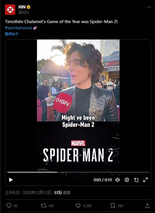 在前几日举办的TGA2023上,IGN对蒂莫西·查拉梅特(Timothée Chalamet)进行了一段简单的采访,其中被问及到有关于年度游戏的问题时,甜茶表示:“《漫威蜘蛛侠2》是我的年度游戏,这游戏太令人惊奇了!” 而当记者问及甜茶喜欢游戏的哪一个部分时,甜茶说道:“我不想放弃游戏的任何一个部分。” |