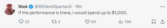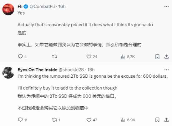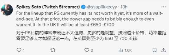 近日,外媒Wccftech曾根据泄露的参数分析,PS5 Pro的售价预计会比目前的新款贵100美元,也就是600美元(约合人民币4274元)。今日,博主@xMBGx发文询问:你会买600美元的PS5 Pro吗? 评论中,不少玩家都表示会入手:“如果它能做到我认为它该做的事情,那么这个价格就是合理的。”“如果有性能(升级)的话,我愿意多花1000美元。” 不过也有玩家更介意性能升级幅度,或者第一方游戏表现,表示暂时不想买。 |