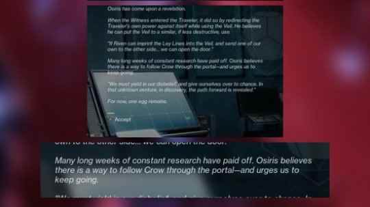 在《命运2》的全息投影简报中有这样一句话:“欧西里斯相信有一种方法可以跟随乌鸦通过传送门,并敦促我们继续前进。”